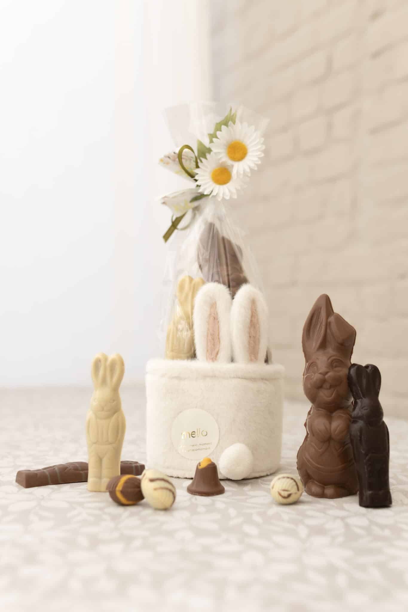 Bont konijntje gevuld met chocoladen haasje en gevulde eitjes